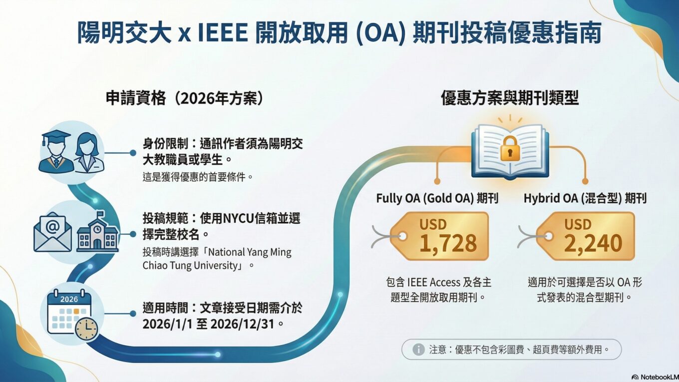 繼續閱讀服務內容 自 2023 年起,本校通訊作者投稿 IEEE Fully OA 期刊可享 APC 優惠;自 2026 年起,投稿 IEEE OA 期刊(Fully OA 或 Hybrid OA)均可享優惠。 IEEE 各學會可視情況調整 APC 或提供會員特殊優惠,最終金額以 RSLC 系統顯示為準,每