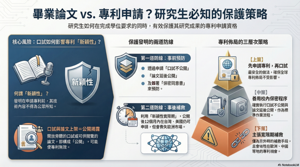 一旦你的技術內容在口試中被「公開」,在專利法的認定上就可能失去「新穎性」,導致後續專利申請遭到駁回。這篇文章將帶你了解如何透過學校的程序來保護你的發明,以及萬一不小心公開了,還有什麼「救命稻草」可以挽回。