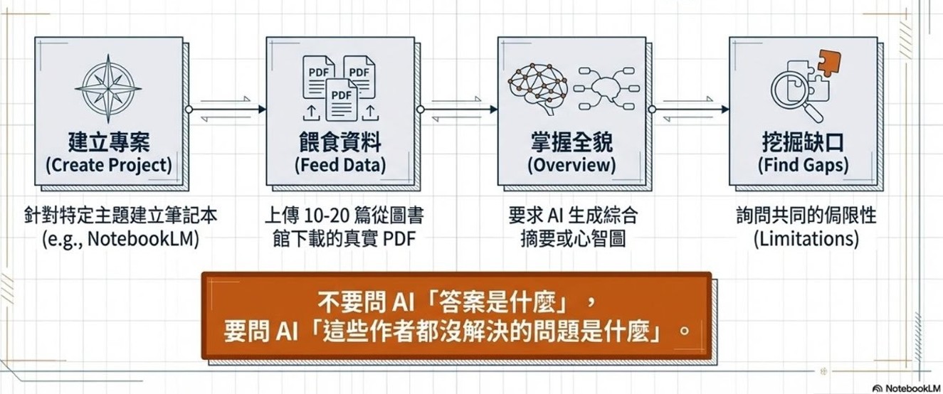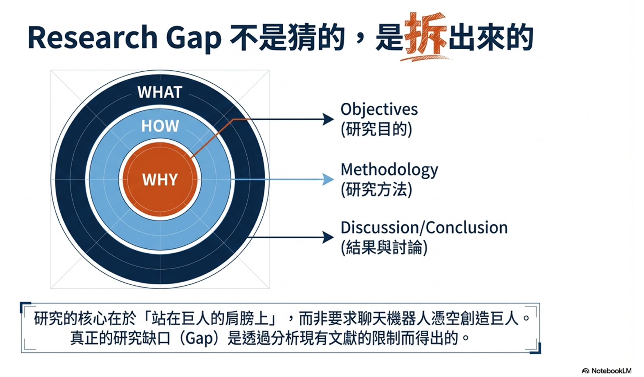 因此,我們必須將研究視為一場精密且冷靜的「逆向工程」。這意味著,將頂級期刊中的論文視為高度完成、可被分析的研究成果,而我們的任務不是憑空臆測研究題目,而是透過拆解其邏輯結構、實作條件與實驗瓶頸,逐步萃取出尚未被充分探索的研究缺口(Research Gap)。