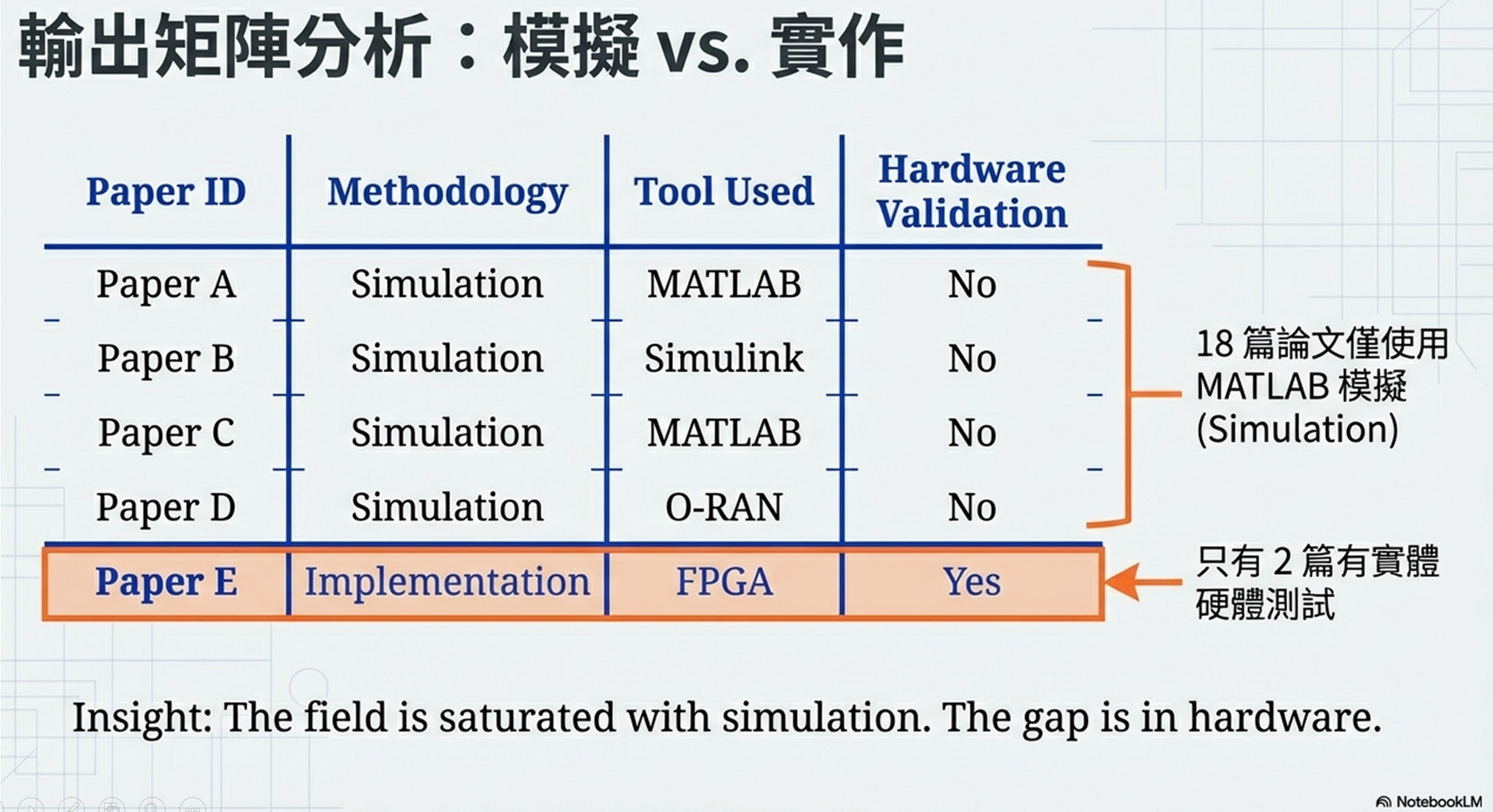 根據上圖顯示,90% 的研究侷限於 MATLAB 模擬,硬體實作僅佔 10%。值得注意的是,現有的實作研究完全忽略「極端溫度」對軟硬體整合的影響。因此,研究缺口就可以聚焦在「極端溫度下的 5G 實體層信號補償」,以拓展硬體實作的研究範疇。