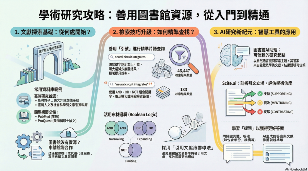 學術研究是一門需要方法與策略的手藝,而非單純的資訊搜尋。從使用雙引號精準鎖定目標開始,到運用關鍵字變形擴大視野,再透過滾雪球法深入學術脈絡,並善用圖書館專屬的 AI 助理、WOS RA解密核心文獻以及 Scite.AI 來辨析觀點,這五個技巧構成了一套從基礎到進階的完整研究流程。