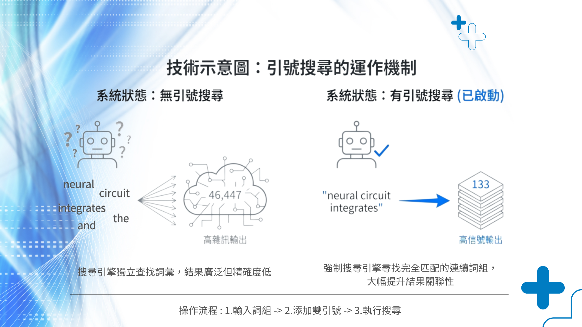 在學術搜尋的起點,最基本也最常被忽略的技巧,就是善用雙引號(” “)。許多人誤以為搜尋引擎會自動理解我們輸入的詞組,但事實並非如此。