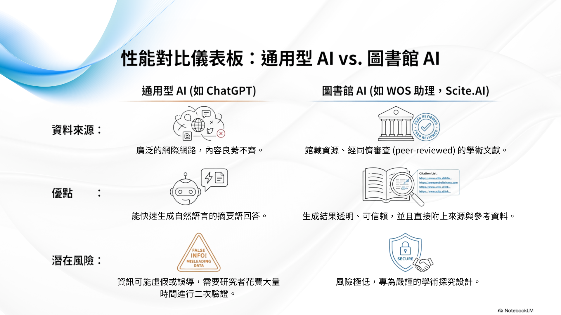 在嚴謹的學術領域,選擇正確的工具至關重要。圖書館的 AI 就像一位訓練有素、可靠的研究助理,它提供的每一條資訊都有據可查;而通用型 AI 則更像一位需要時刻監督的實習生,你必須對其產出的所有內容保持警惕。