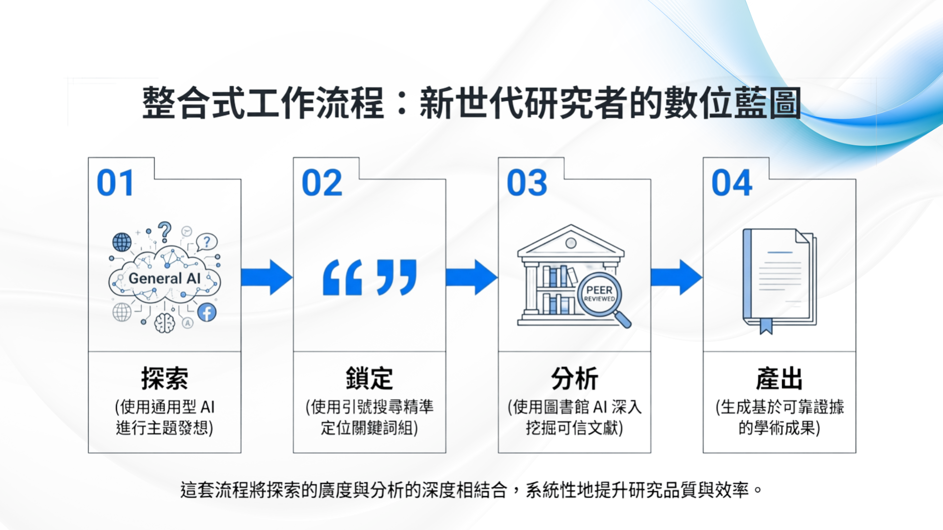 真正的策略師不僅是選擇工具,更是懂得如何組合工具,打造一套高效的研究流程。以下是一個從宏觀到微觀,善用圖書館AI工具的三階段流程: