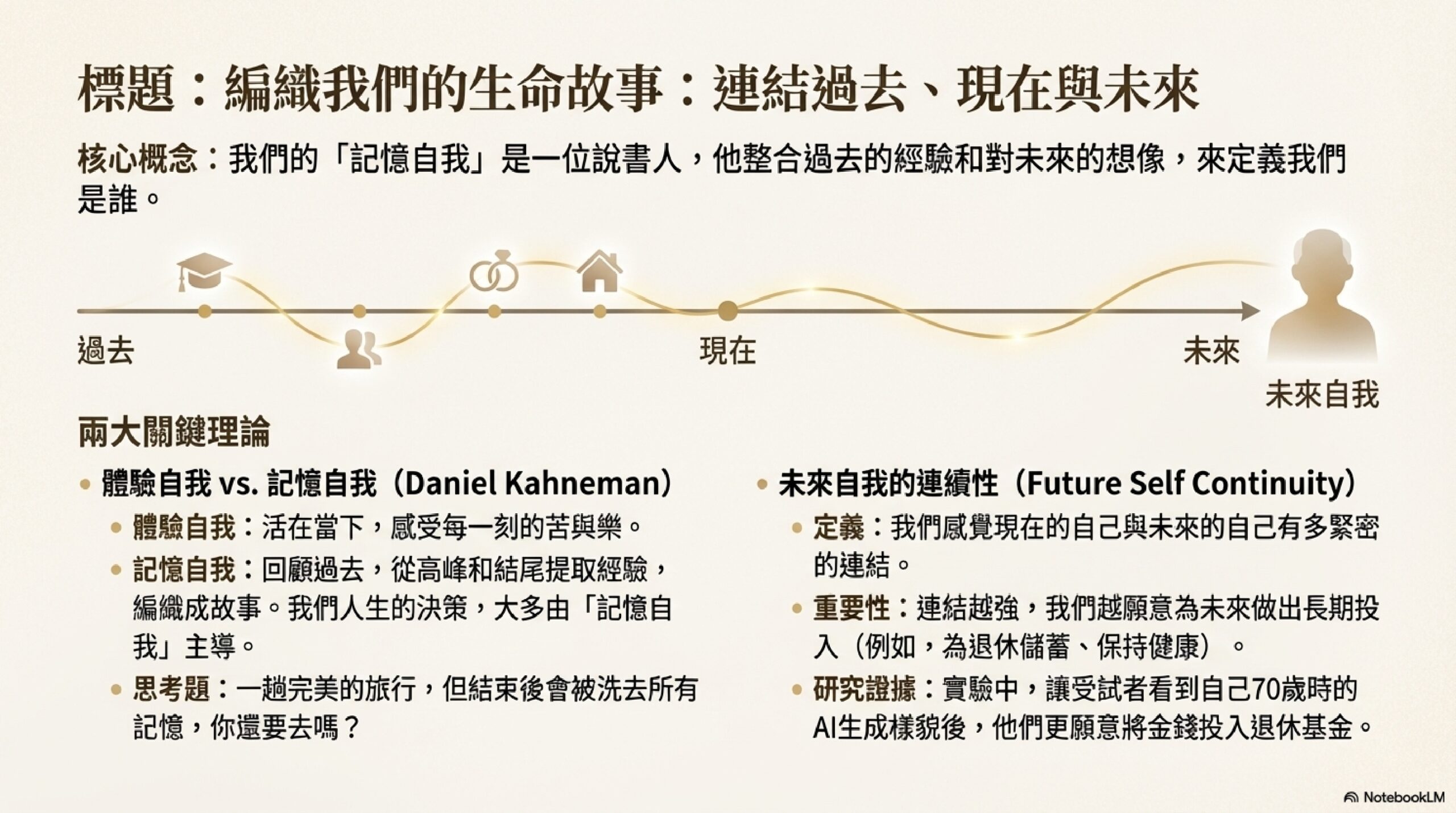 - 記憶自我 (Remembering Self): 這才是我們心智圖書館的總館長兼首席故事官。它是一位說書人,不僅回顧過去,從經歷中提取高峰與結尾,更重要的是,它會整合過去的經驗和對未來的想像,來編織定義「我們是誰」的宏大敘事。我們人生中絕大多數的重大決策,都是由這位故事官所主導。