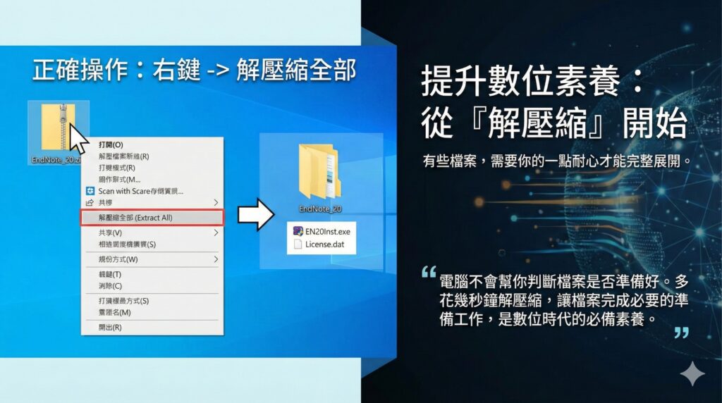 電腦只會照著當下的狀態運作,它不會幫你判斷檔案是否準備就緒 。培養「數位耐心」,懂得等待檔案完成解壓縮這道必要程序,是讓我們在數位環境中保持不慌、不亂的重要能力 。