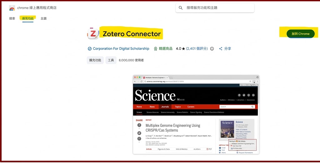 下圖是選擇「Zotero Connector」安裝時加至Chrom的擴充功能。