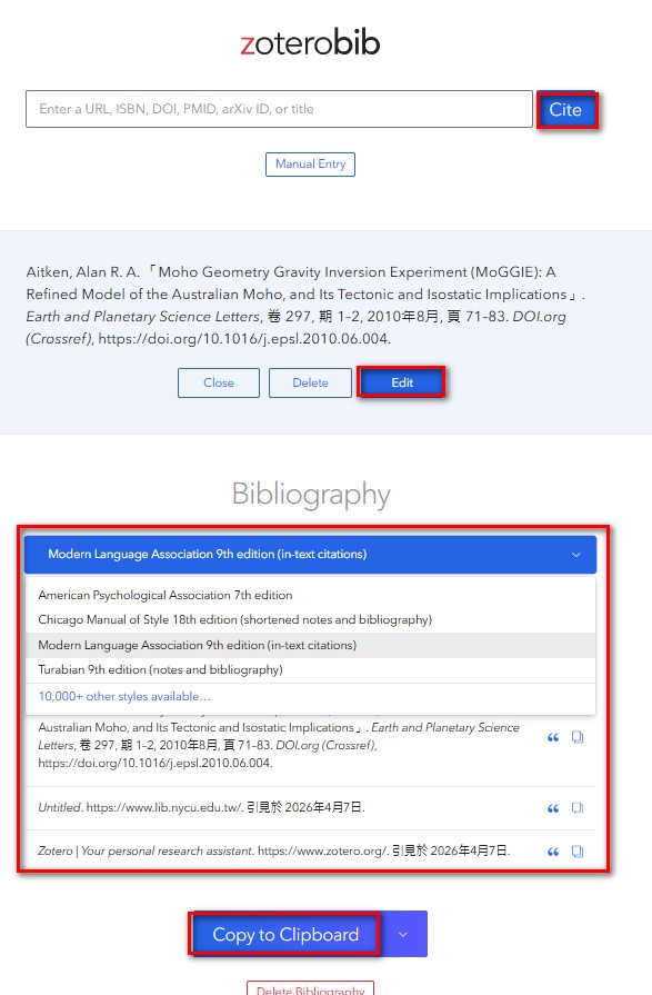 另外,還有一個免登入手動單筆快速取得引用文獻的zoterobib功能喔!針對取得的引用書目進行修編後複製、下載、儲存到Zotero剪貼簿。