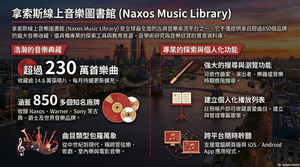 - 海量館藏與多元曲目: 收錄超過數十萬張唱片,涵蓋四萬多位作曲家。