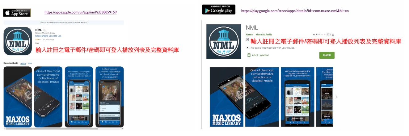 拿索斯古典音樂圖書館(Naxos Music Library, 以下簡稱NML),曲目齊備,包含管弦樂、協奏曲、歌劇、器樂曲、室內樂、聲樂、合唱-聖樂、合唱-世俗、聲樂合唱、芭蕾、輕歌劇、管樂合奏、影視音樂、現代器樂、當代爵士、世界音樂、流行及搖滾、中國音樂等。從中古時期音樂到現代作曲家作品等,包羅萬象。