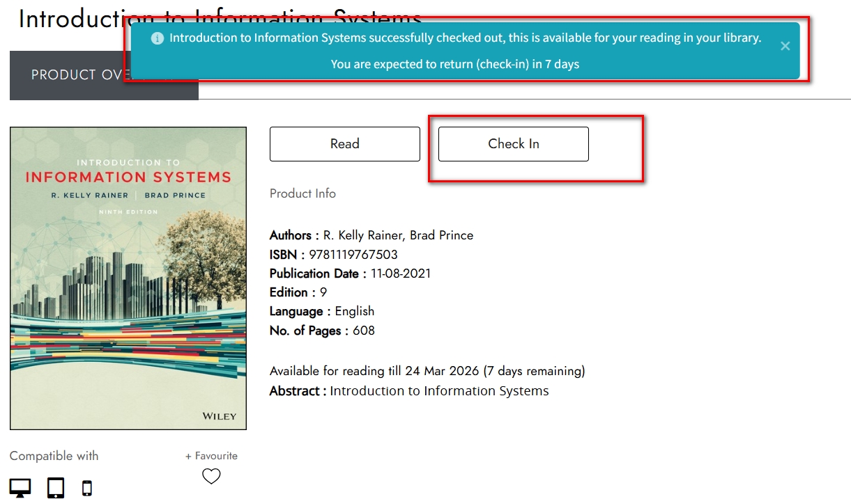 4.為了讓其他師生也有機會使用,看完書請點選「check in」還書,7天期滿會自動還書。